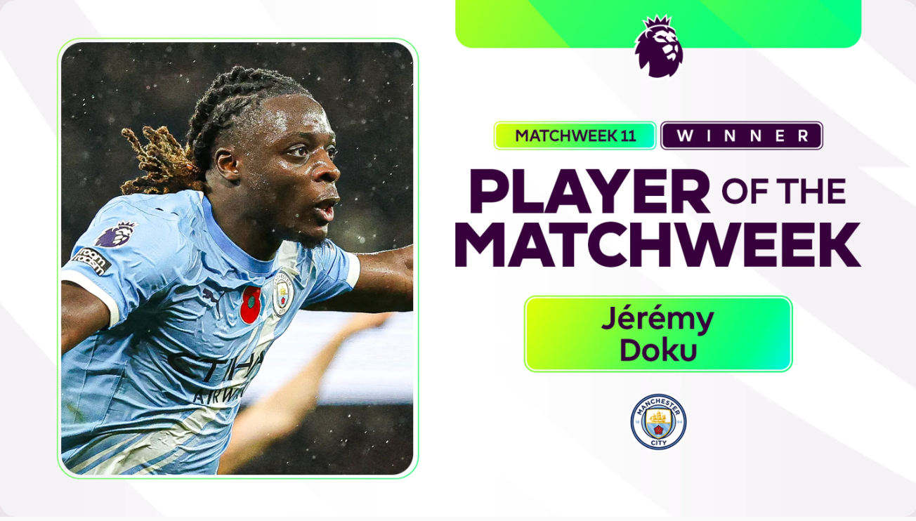 According to EPL official, Jeremy Doku from Manchester City has been voted Player of Matchweek 11 due to his performance against Liverpool last weekend.