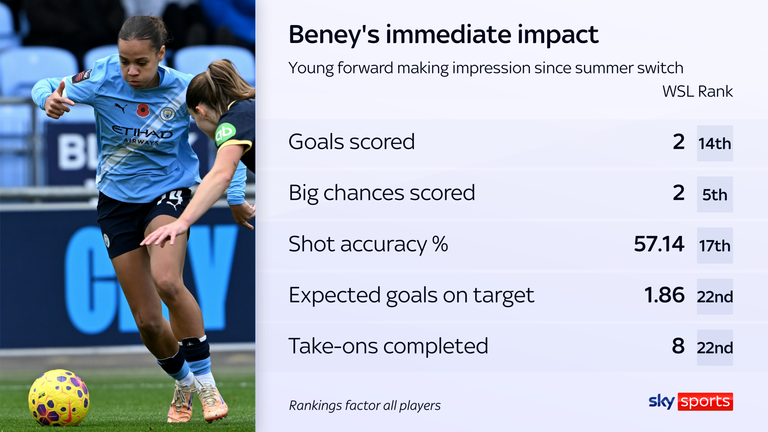 Despite her relatively modest demeanour, Beney's playing style is best encapsulated by boldness. Shortlisted for the 2025 Golden Girl award - won by Michelle Agyemang - she's already come up clutch in big moments, netting the winner in a 3-2 victory over Arsenal and the equaliser as City came from behind to beat Liverpool in October.