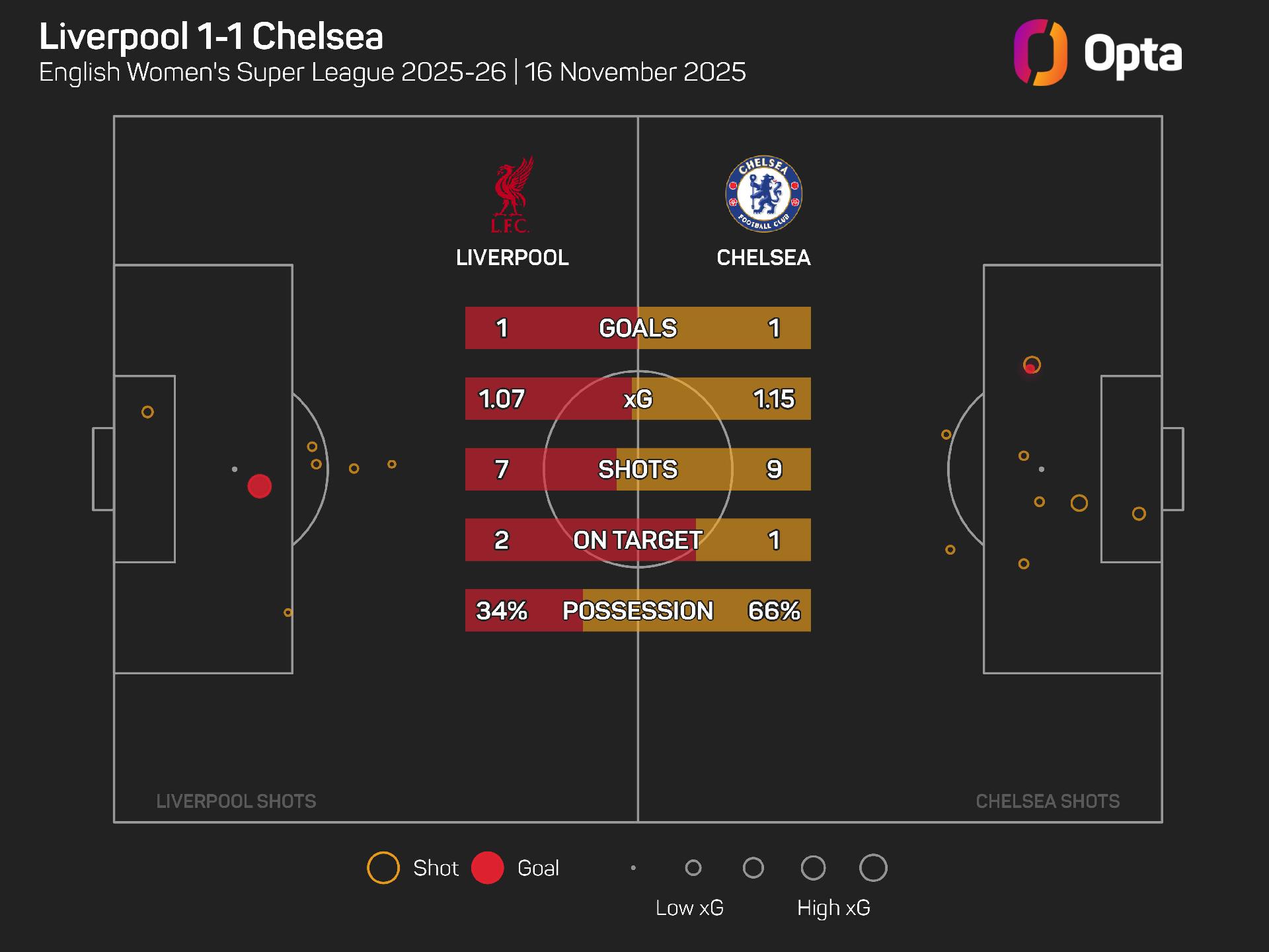 Chelsea were far from their free-flowing best on Merseyside, only just edging the expected goals (xG) battle by 1.15 to 1.07, attempting a mere nine shots and getting one on target – that latter figure is their fewest in a WSL game this season.