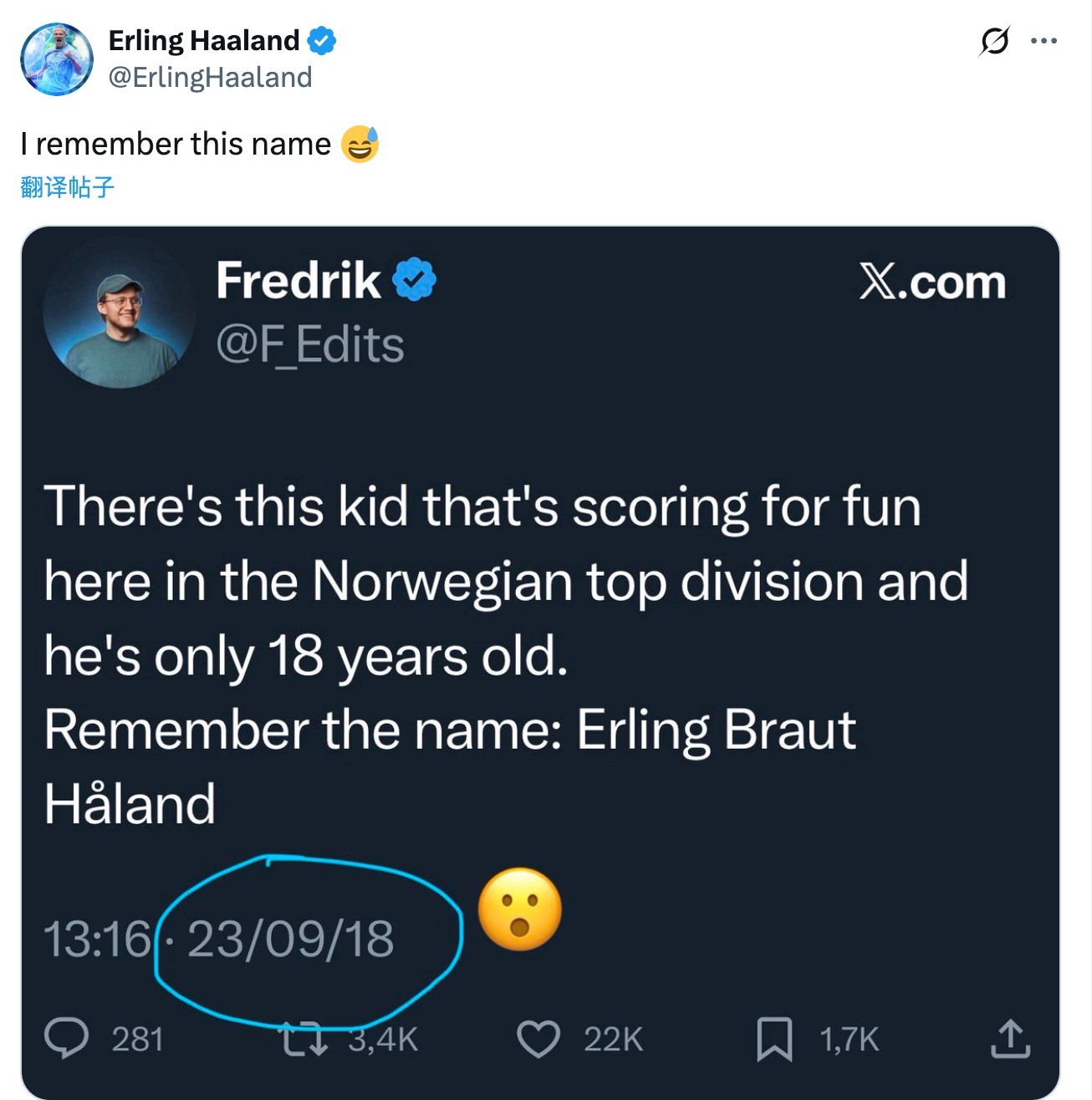 Seven years ago netizens praised Haaland and today Haaland retweeted it