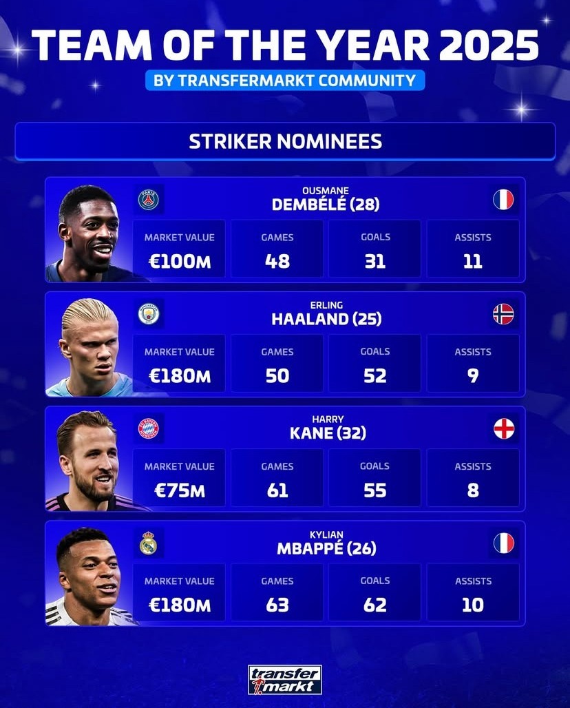 Transfermarkt's Best Striker Nomination of 2025: Dembélé, Haaland, Kane, Mbappé