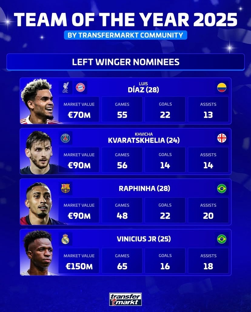 Transfermarkt's Best Left Winger of the Year: Raphinha and Vinícius are included