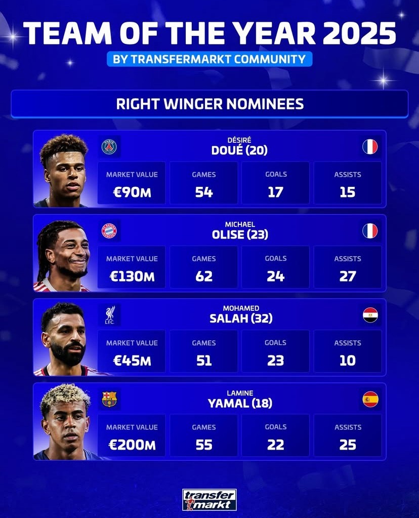 Transfermarkt's Best Right Winger of the Year: Salah and Yamal are included