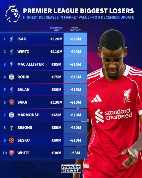 Transfermarkt has listed the top ten 'victims' from the recent EPL player value update, 4 Reds are listed.