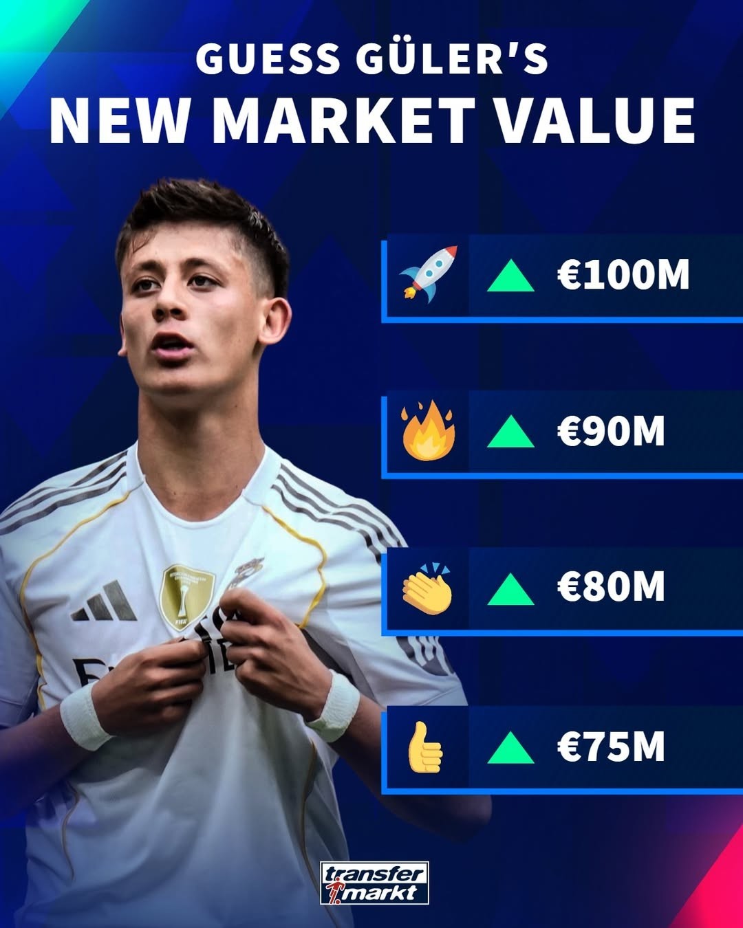Transfermarkt has been speculating on Güler's next transfer fee, which could rise to at least €75 million and as high as €100 million.