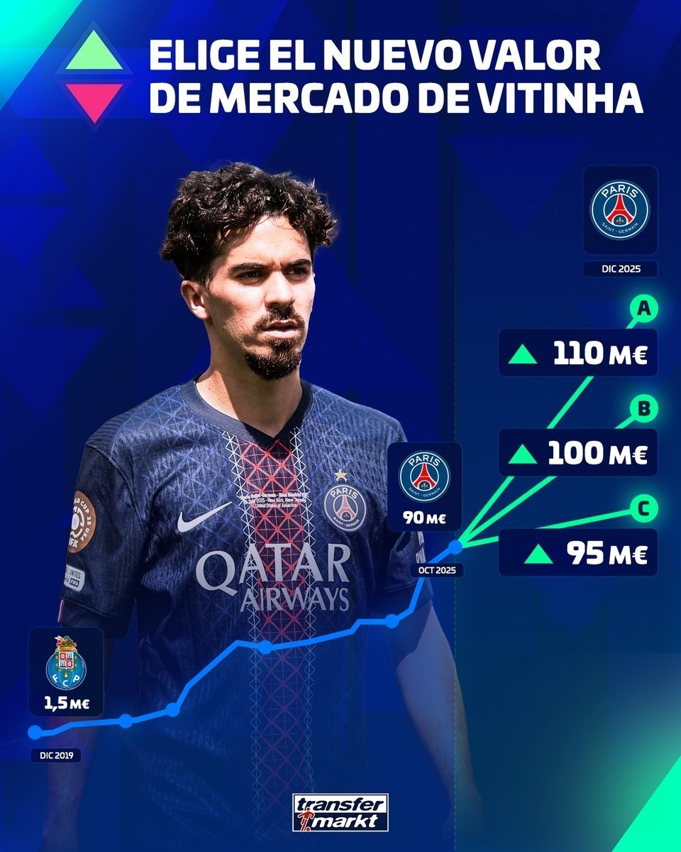 With the upcoming update to Ligue 1 player valuations, Transfermarkt has previewed a new market value for Paris Saint-Germain midfielder Vitinha, offering three options for an increase, ranging from a maximum of €110 million to a minimum of €95 million.