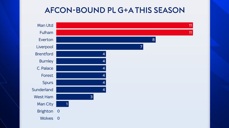 For the Cottagers, the biggest losses, in terms of minutes played, are Alex Iwobi and Calvin Bassey, both of whom represent Nigeria. For United, it's Cameroon's Mbeumo and Ivory Coast's Amad.