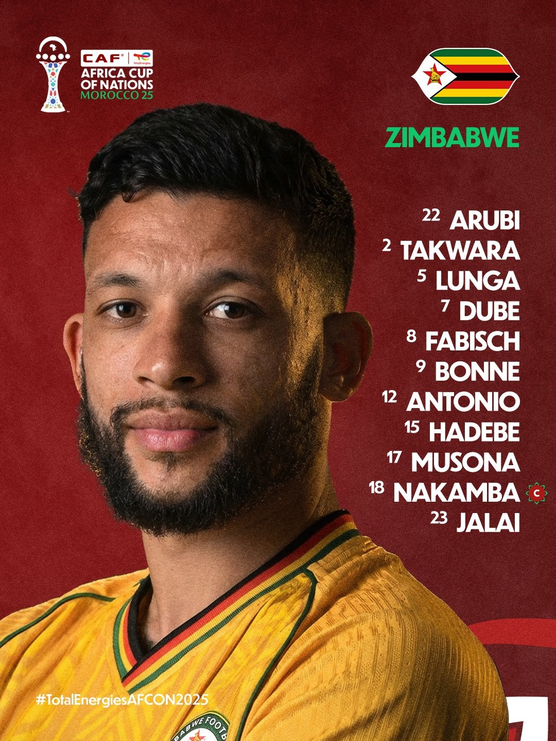Zimbabwe Starting XI: Arubi, Takwara, Lunga, Due, Fabisch, Bonne, Antonio, Hadebe, Musona, Nakamba(C), Jalai