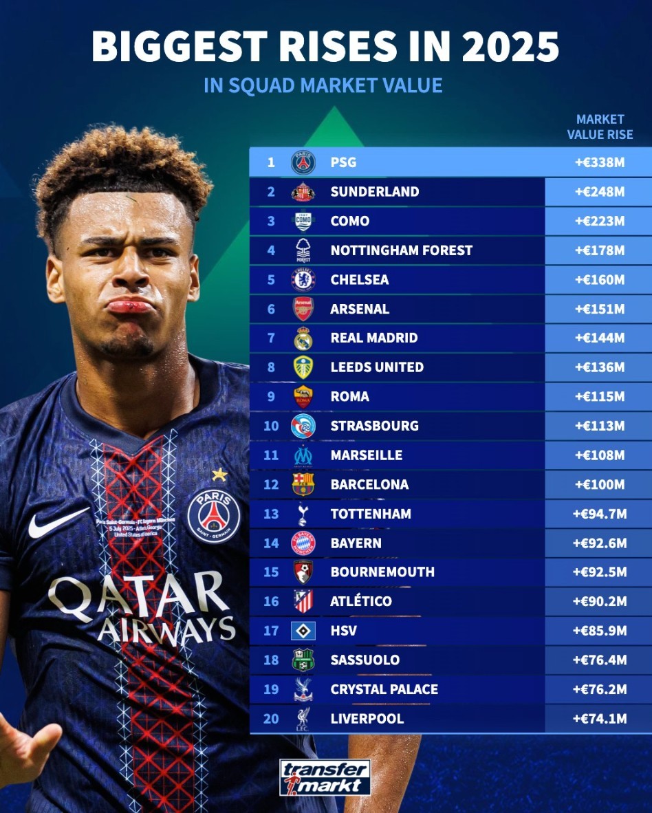 On December 28, Transfermarkt listed the 20 clubs with the highest market value increase in 2025. Paris Saint-Germain topped the list with an increase of 338 million euros, followed by Chelsea, Arsenal, Real Madrid, Barcelona, Bayern Munich, and Liverpool.