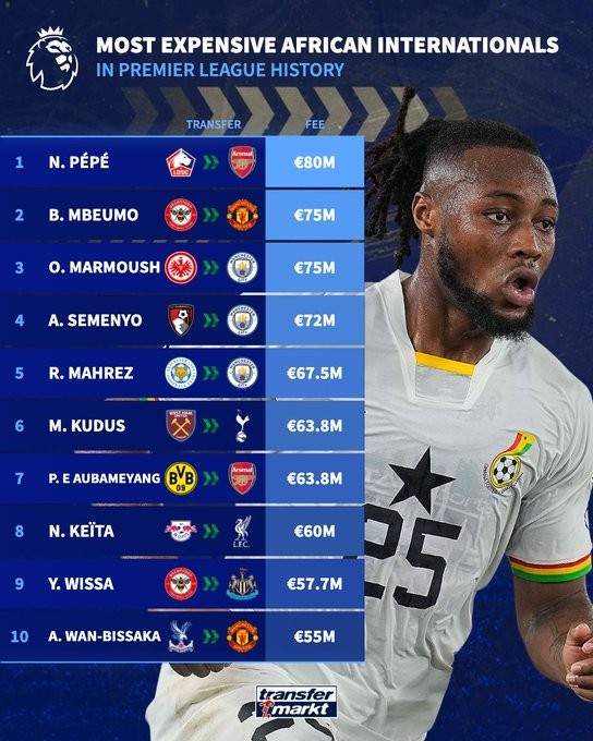 According to Transfermarkt's statristics, Semenyo's move to Man City made him the fourth most expensive African players in Premier League.