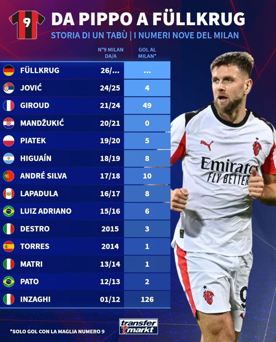 On January 9, after Füllkrug officially took over the number 9 jersey at AC Milan, Transfermarkt listed the number of goals scored by all the previous owners of the number 9 jersey since Filippo Inzaghi while playing for the team. Only Giroud scored more than 10 goals.