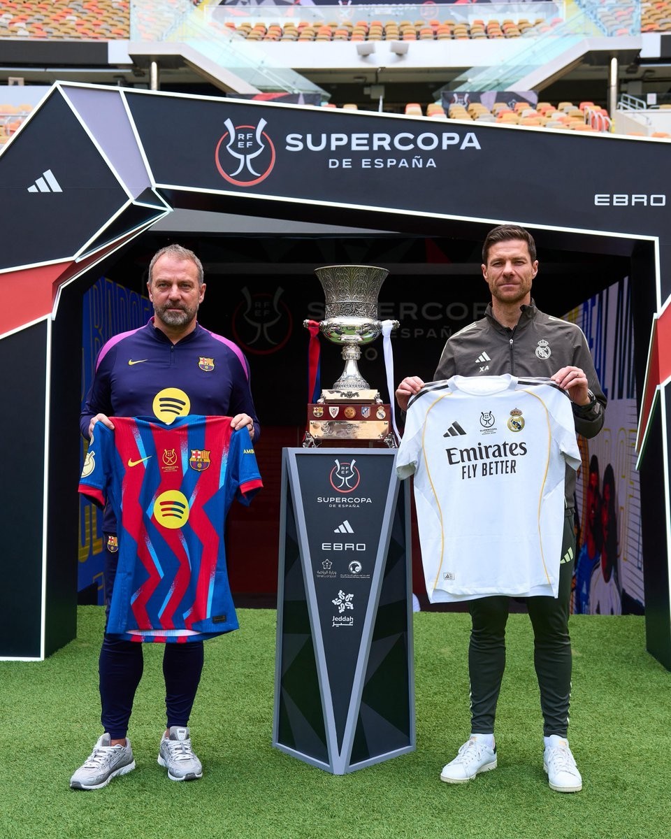 Before the 2026 Spanish Super Cup final, as part of the tradition, Barcelona coach Hansi Flick and Real Madrid coach Xabi Alonso posed for a photo in front of the trophy.