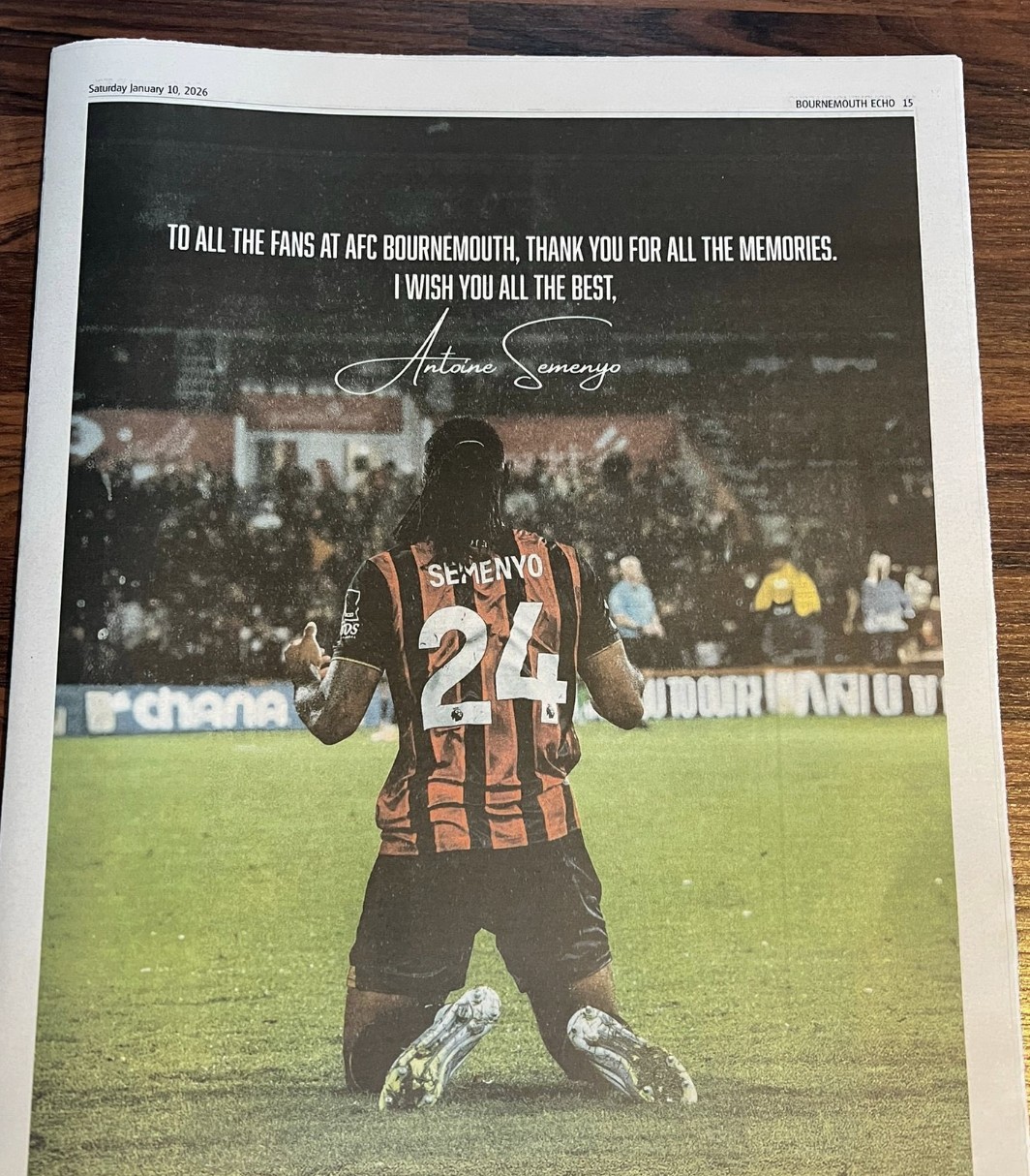 On January 10 local time, Antoine Semenyo, who has transferred to Manchester City, published a full-page advertisement in the Bournemouth Echo to thank the Bournemouth fans.