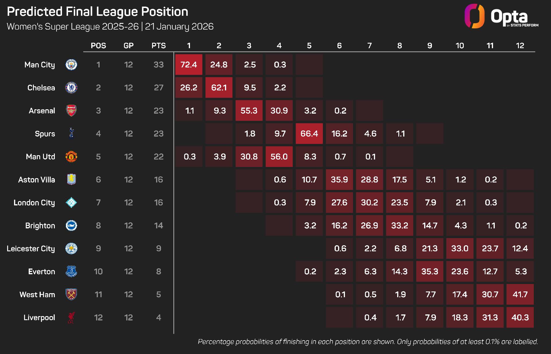 And they are backed to pick up their 12th win of the season by the Opta supercomputer, with the pre-match simulations handing them a 71.3% win probability, the highest of any side in the WSL this weekend. The Lionesses won just 12.7%, while a draw was given a likelihood of 16%.