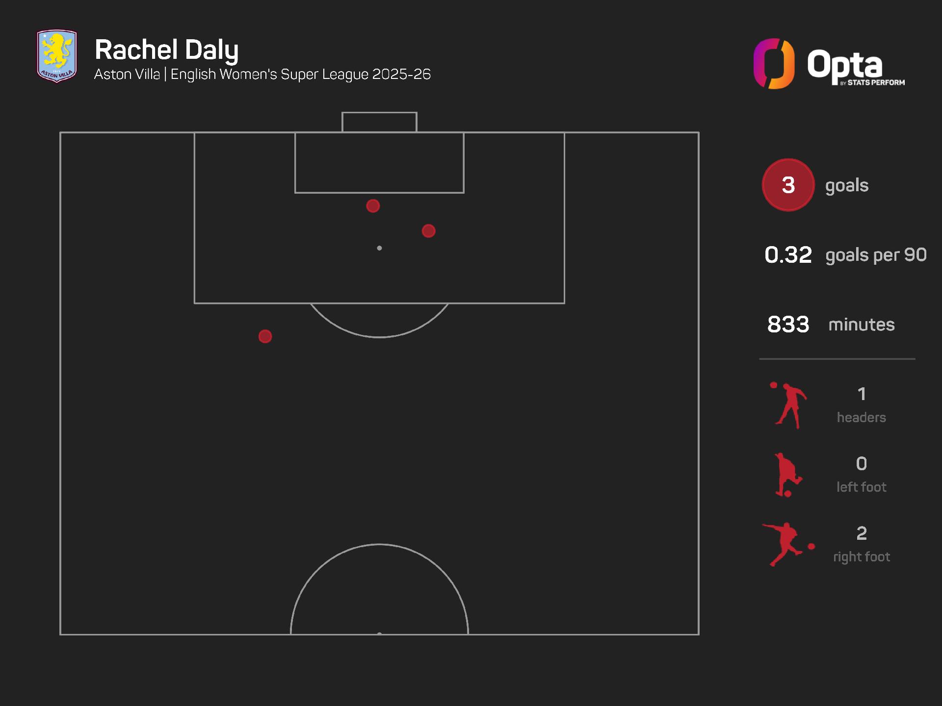 And United will need to look out for Rachel Daly, who has scored four of Villa's five WSL goals against United, also netting three goals in her last two league outings at home. She last netted in three straight at Villa Park in November 2023, a run of four that included a strike versus the Red Devils.