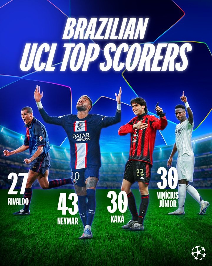 Vinicius's UCL goal tally equals Kaká's, placing him 2nd among Brazilian players