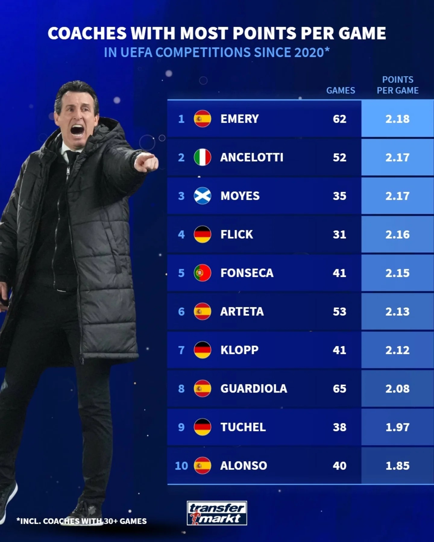On 23 January, Transfermarkt lists the average points per game for coaches in UEFA competitions. Emery ranks first with an average of 2.18 points per game.
