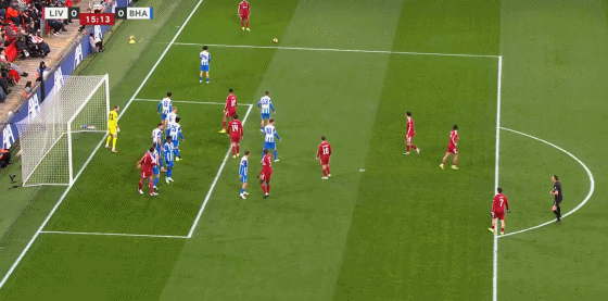 萨拉赫主罚小角度任意球直接攻门,皮球偏出立柱