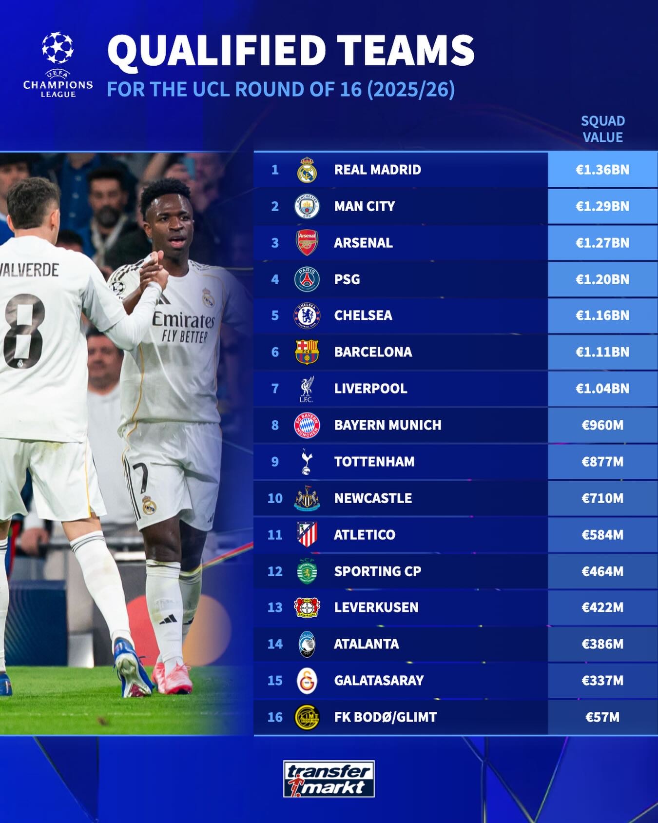 On February 26, after the Champions League play-offs concluded, Transfermarkt ranked the teams that advanced to the Round of 16 by market value.