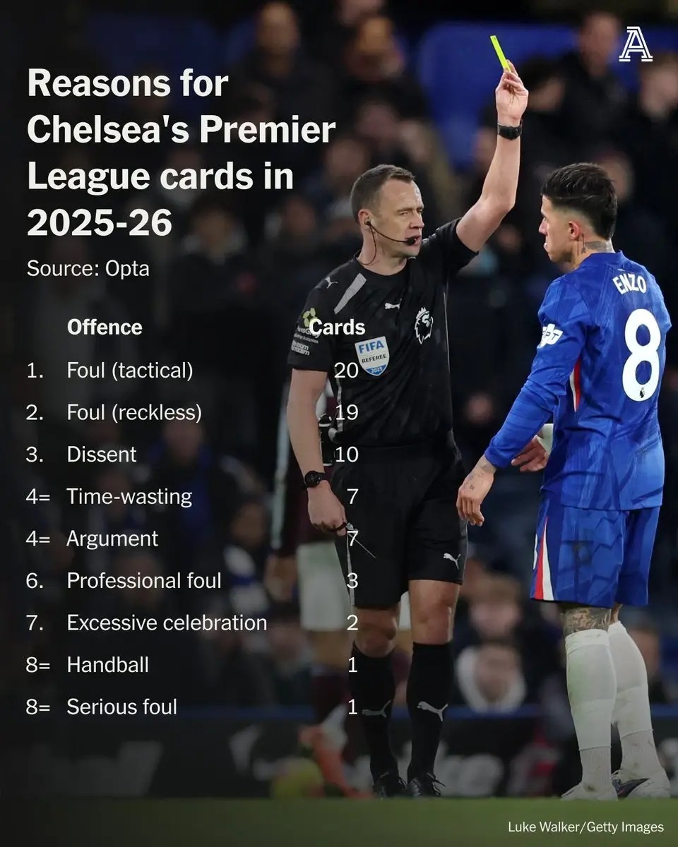 Chelsea's EPL card count this season: 20 for tactical fouls, 10 for dissent