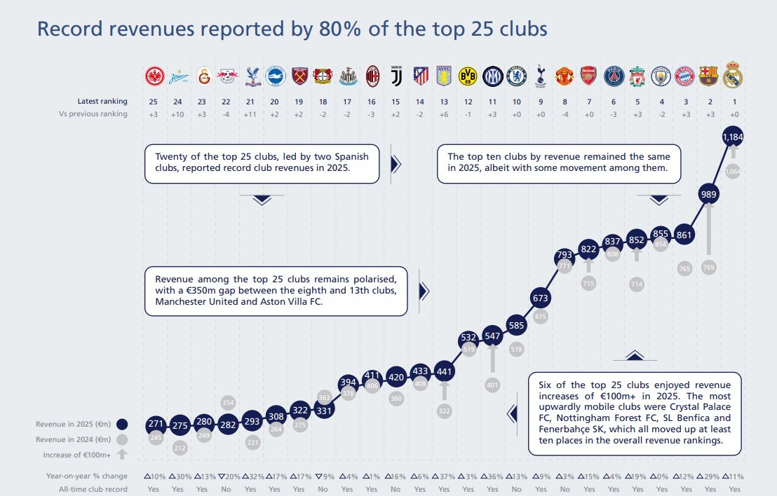 UEFA 2025 club revenue ranking: RM first, EPL occupies six of the top 10 spots