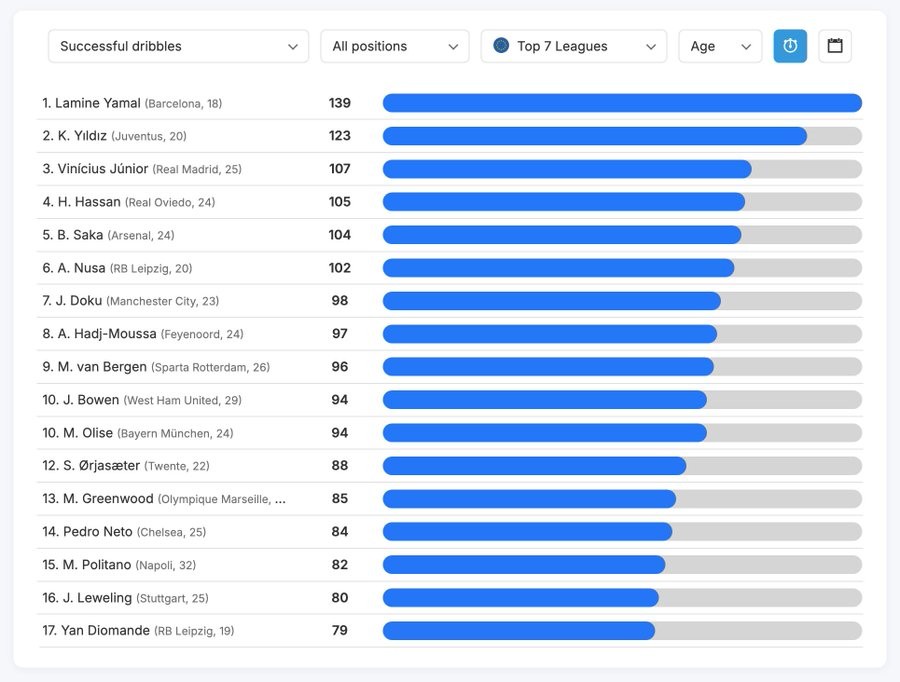 Football statistics website Datamb football collects the statistics of top dribblers in European top leagues in 2025/26 season. Lamine Yamal the Barca young gem has excelled in this category.
