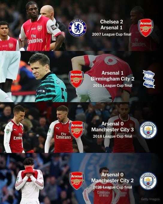 In the just-concluded EFL Cup final, Arsenal lost 0-2 to Manchester City. With this result, Arsenal suffered a four-game losing streak in EFL Cup finals and once again missed out on the championship of this tournament