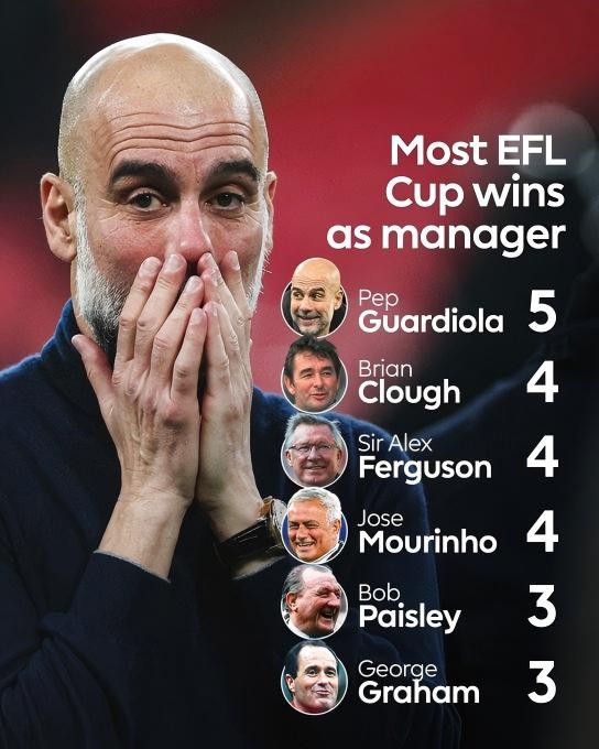 In the 2026 EFL Cup final, Manchester City defeated Arsenal 2-0 to win the title, and Guardiola became the first manager to win the EFL Cup five times.