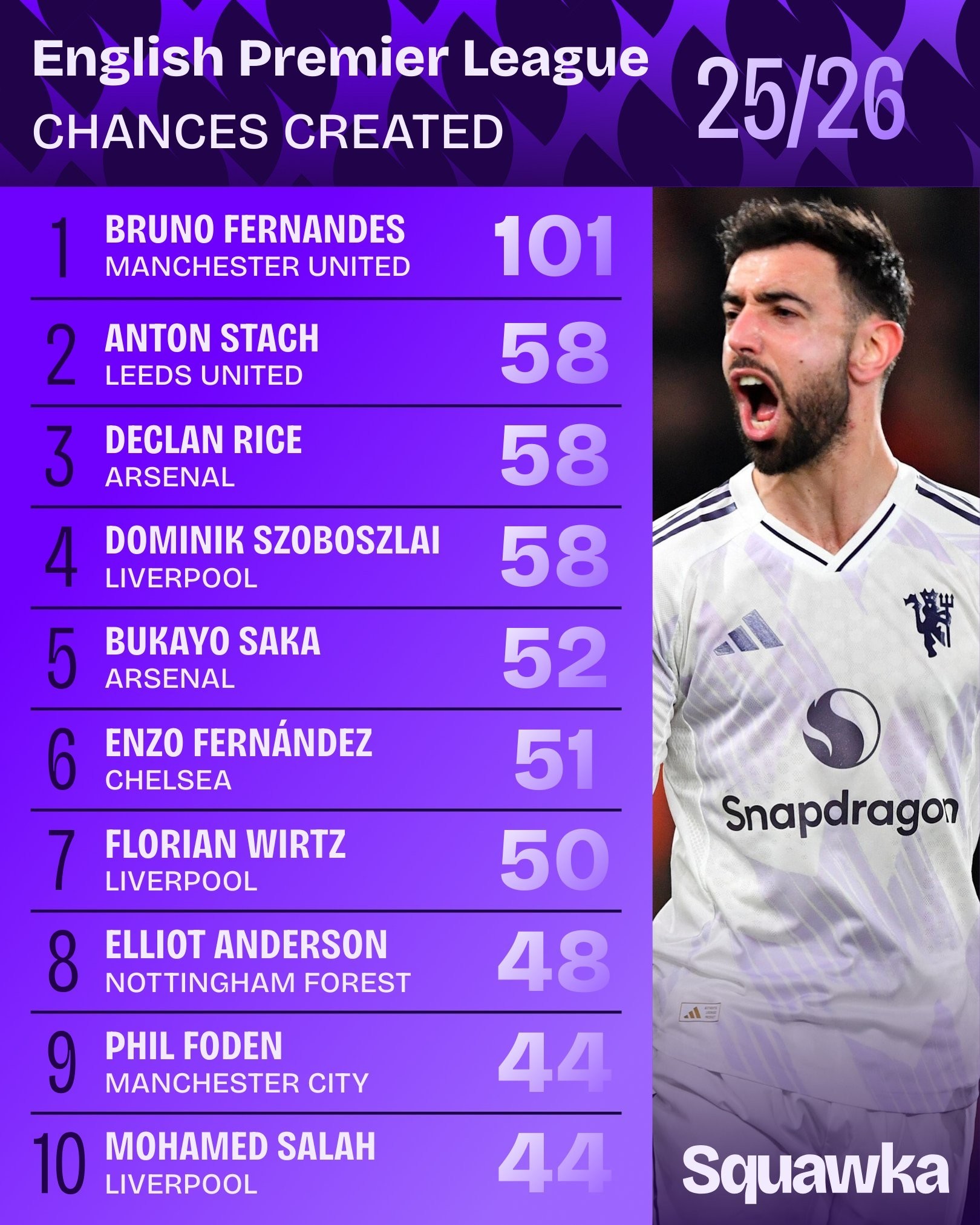 PL chance creation standing: Bruno Fernandes tops, Rice, Szoboszlai second