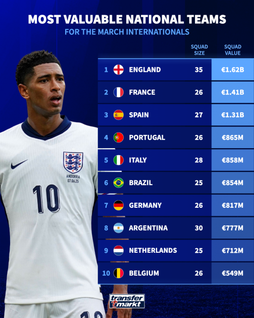 Transfermarkt lists the most valuable international squads for March fixtures