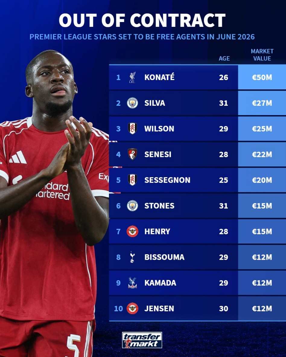 Transfer Markt listed the market value list of Premier League players whose current contracts expire in June. Liverpool centre-back Konate ranks first with €50m, and Manchester City's Bernardo Silva and Stones are on the list.