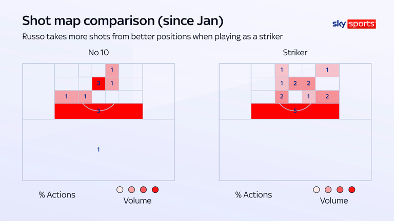 The graphic below indicates the frequency and positioning of Russo's shots taken from the No 10 position versus out-and-out forward since the turn of the year. It's clear to see the output increase on the right.