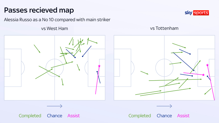 Comparing Russo's role in victory over West Ham with her function against Spurs at the weekend - Arsenal scored five in both - offers interesting insight.