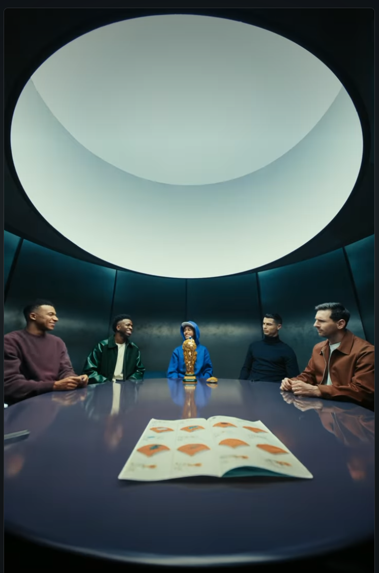 In the video, Messi, Ronaldo, Mbappe, and Vinicius Jr. are sitting around a round table to piece together a LEGO toy of the World Cup trophy. After rounds of spinning the wheel on the table to decide who to place their minifigure on top of the trophy and finish the installation, the wheel stops at the front of a kid, who takes out the little man from inside the trophy and places it on top.