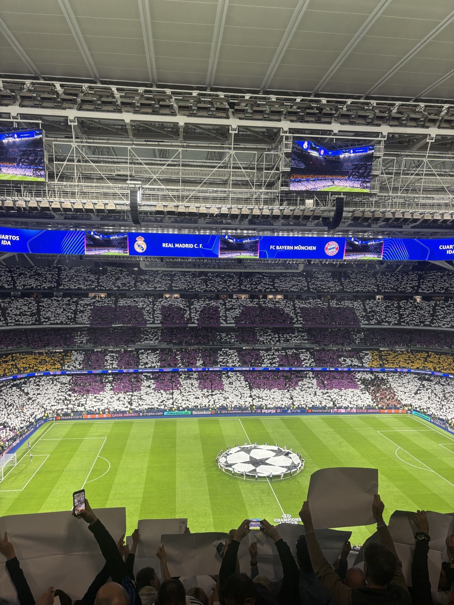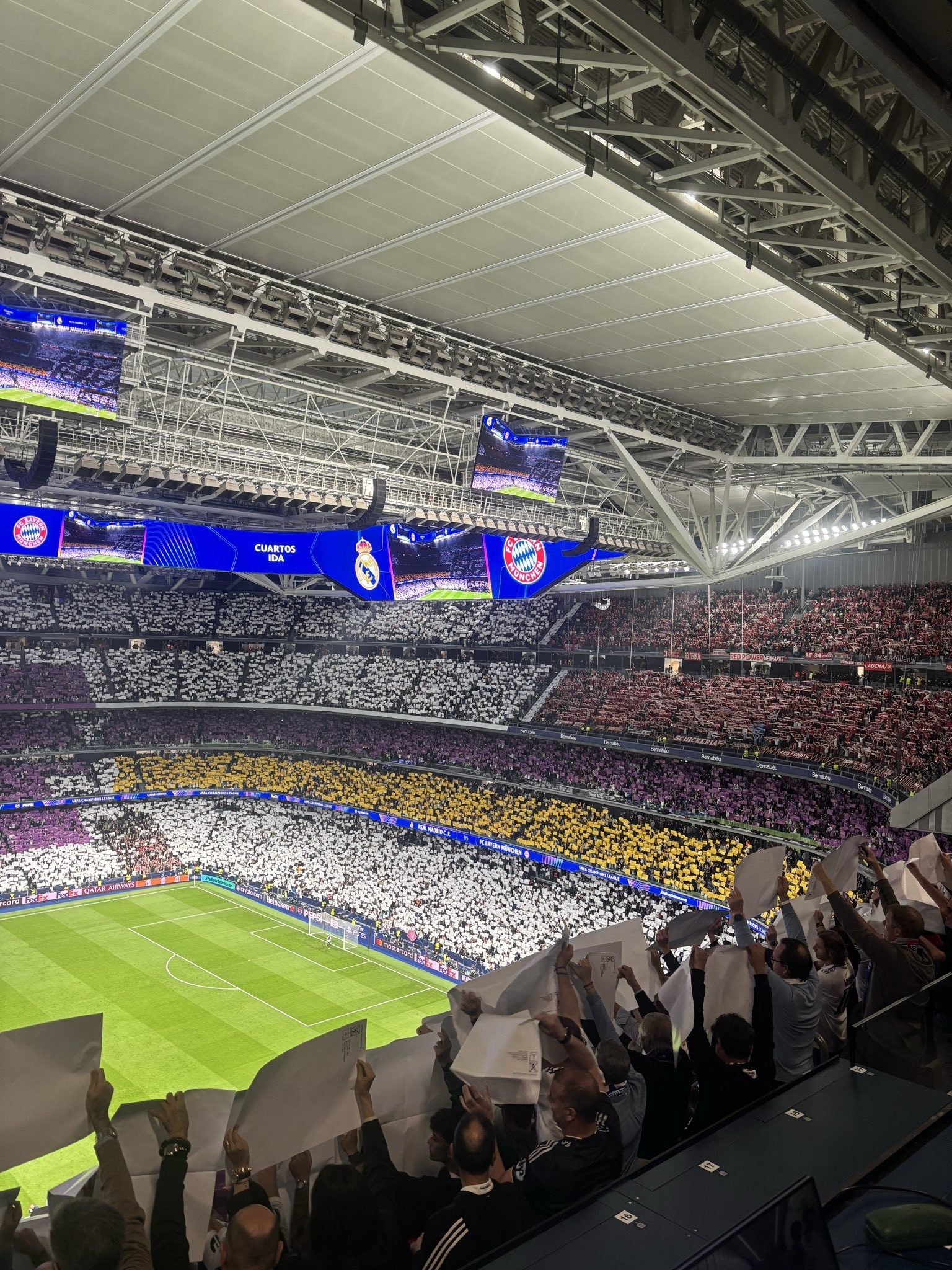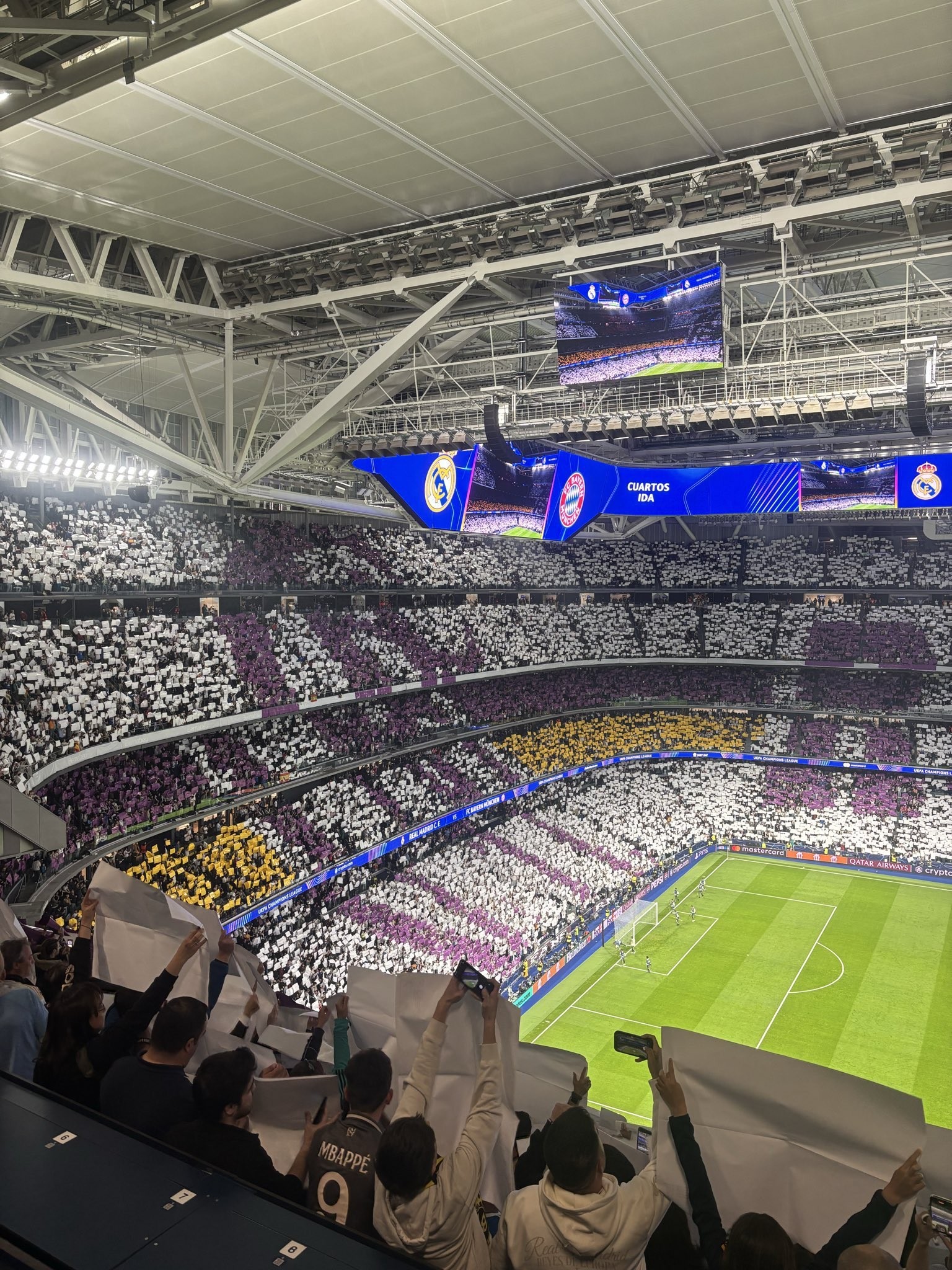سيطر اللونان الأبيض والأرجواني على التيفو مع لمسات ذهبية. ومع بدء العرض، بلغت حرارة الأجواء ذروتها؛ وردد الجمهور هتافات تشجيعية، وتصفيق وهتافات كادت تهز مدرجات برنابيو.