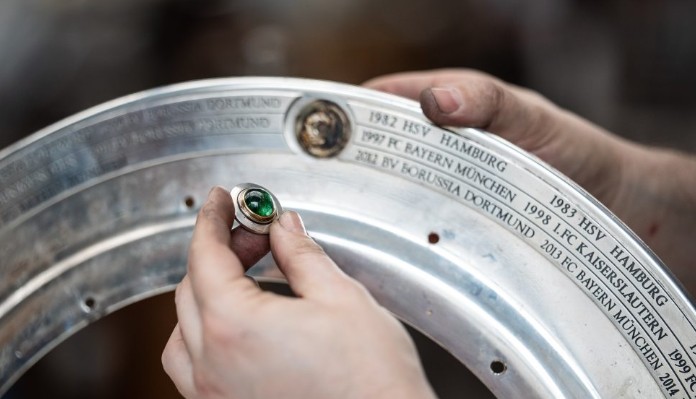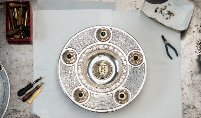 自1903年以来所有德甲冠军的名字都镌刻在奖杯上,每个赛季结束后,新冠军的名字会被添加进去,1981年,沙拉盘首次扩容:加装了一个银环,环上配有刻字板以及5颗总重71.98克拉、镶嵌在黄金底座中的翠榴石弧面宝石